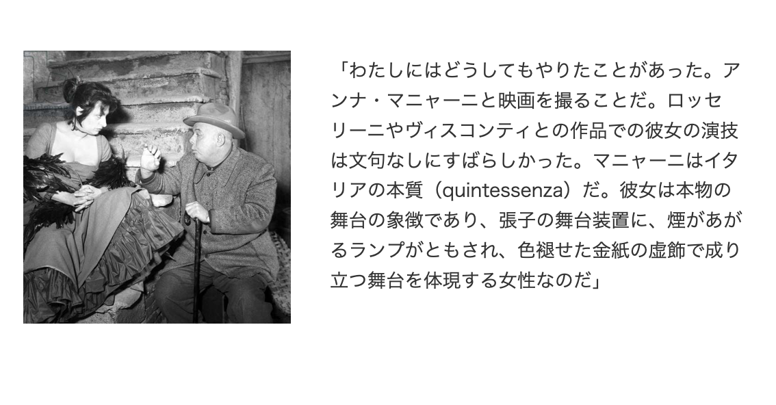 そのヴィスコンティがぜひとも演出したいと願ったのがアンナ・マニャーニでした。そのころヴィスコンティが考えていたのは、ヴァスコ・プラトリーニの小説『Cronache di poveri amanti(哀れな恋人たちの日誌)』(1946 [1936]*1)や、『カルメン』で知られれるプロスペル・メリメの『Le Carrosse du Saint-Sacrement (聖なる秘蹟の馬車)』(1830)(オッフェンバッハの『ラ・ペリコール』の原作)の映画化。しかし実現することなく、後にそれぞれカルロ・リッツァーリとジャン・ルノワールの手によって映画化されることになります。