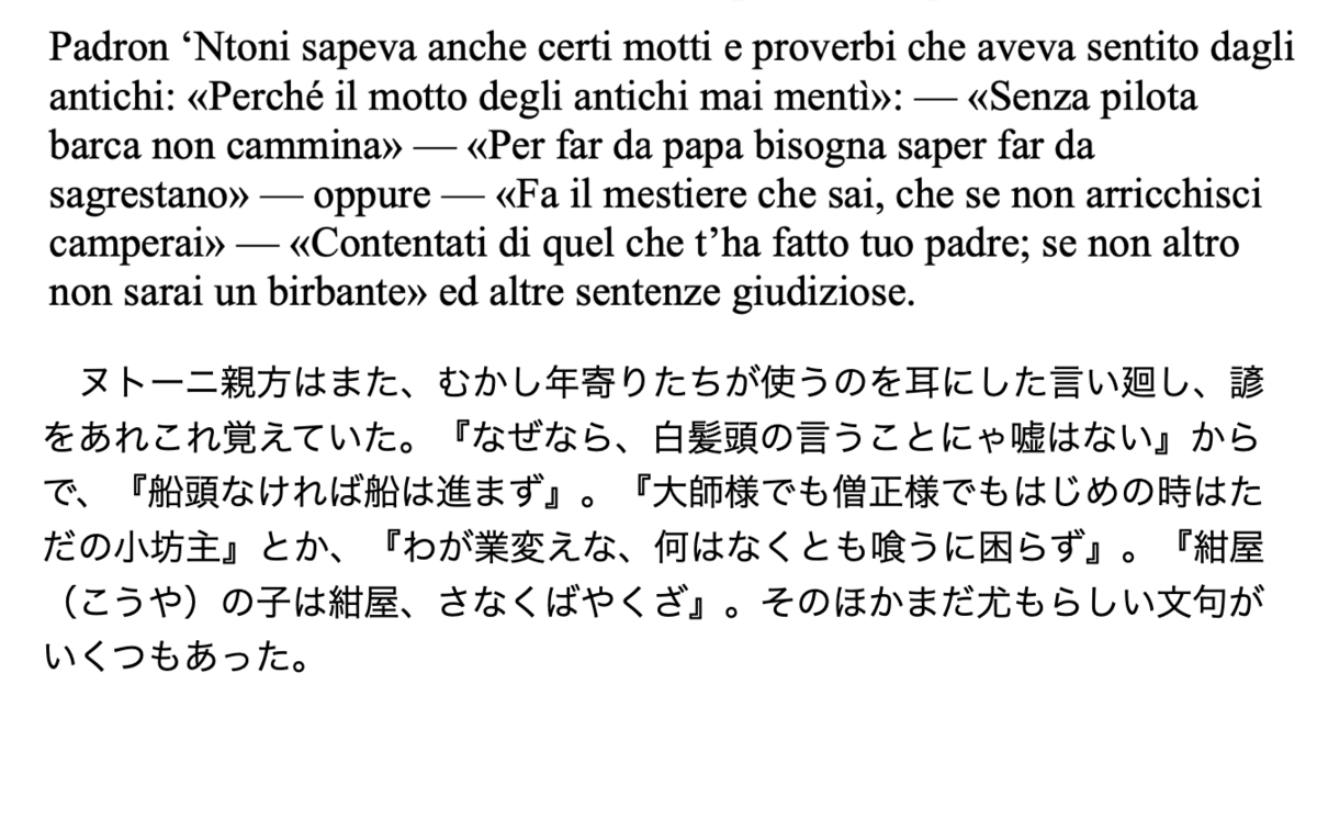 この点に関しては、みすず書房から出ている邦訳『マラヴォリヤ家の人々』(西本晃ニ訳)にも同じ問題があります。標準的イタリア語を、わざわざ日本語の田舎言葉や古語もどきに訳ているのです。例をあげておきましょう。第1章、「格言」を引用して話をするウントーニ親方(Padron 'Ntoni)の描写ですが、とりわけその「格言」の翻訳が、いかにも日本的な昔の格言に訳し直されています。もちろんこれは、あるていど仕方のないことかもしれません。