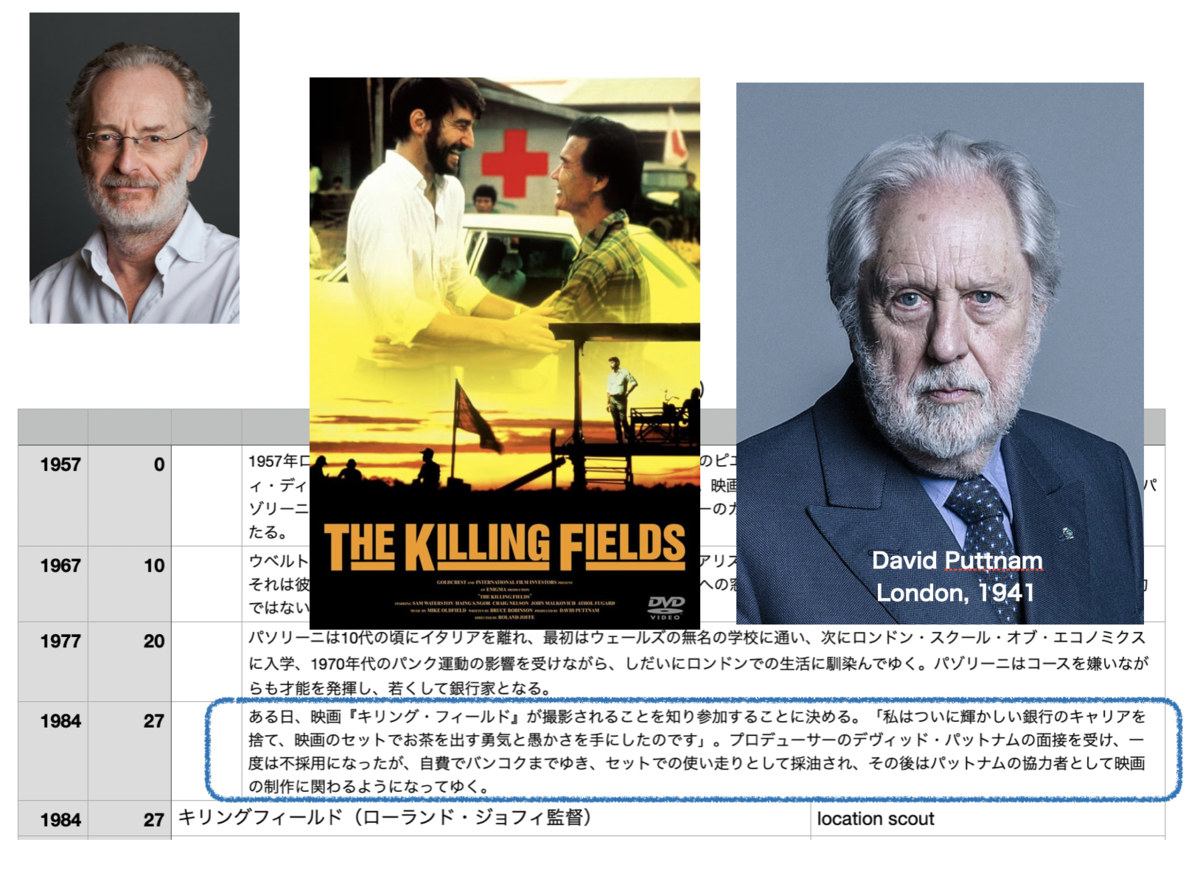 こうして10年ぐらい働いたとき、ウベルトは全てを捨てて映画の世界に飛び込むことになります。きっかけはデヴィッド・パットナムがプロデュース、ローランド・ジョフェイが監督した『キリング・フィールド』(1984)です。制作の話をききつけたウベルトは、パットナムの面接を受け、一度は落とされてしまいます。それでも自費でバンコクの撮影現場にのりこみ、その熱意を認めらて撮影現場のお茶汲みの下働きから始めたというのです。